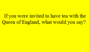 3. Hmmm… I think I would say, “Will Your Majesty be footing the bill for my trip to England, or will Your Majesty be coming to tea at my house?” Because I like to clarify things to make sure there are no frustrations over discrepancies in expectations, later on. Then I would ask, “Does Your Majesty have any herbal tea, because black tea and green tea make me feel like I’m on speed or something”.